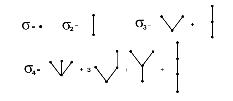 If $[\cdots]$ is the operator that attaches trees to a single root, the example shows that $$\sigma_3=[\sigma,\sigma]+[\sigma_2], \qquad \sigma_4=[\sigma,\sigma,\sigma]+3[\sigma,\sigma_2]+[\sigma_3].$$ This motivates the following theorem.